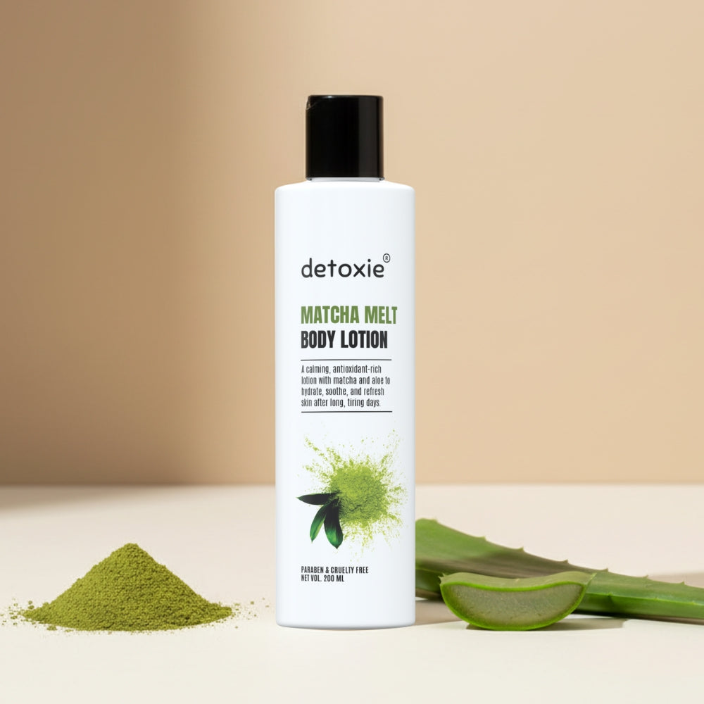 Detoxie Matcha Melt Body Lotion is your daily skin detox in a bottle. Infused with the antioxidant-rich goodness of Japanese Matcha, this lotion helps fight pollution and stress-induced damage while maintaining deep hydration. Its unique fast-absorbing formula combines Shea Butter, Hyaluronic Acid, and Vitamin E to replenish lost moisture, restore elasticity, and improve overall texture without any greasiness. Ideal for all skin types especially dull, dry, or tired-looking skin it’s a perfect post-shower ritual to keep your skin smooth, radiant, and stress-free.